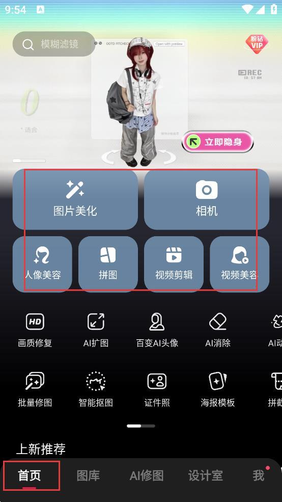 1、下载安装完成之后进入app,首页有图片美化、相机等功能,点击图标可进行照片编辑、拍摄美化,还有人像美容、拼图等工具,快速处理图片。