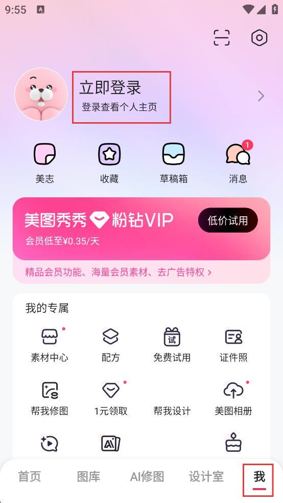 3、点击我的页面可点击立即登录看个人主页,有收藏、草稿箱等,粉钻VIP享专属素材和去广告,按需用会员功能。