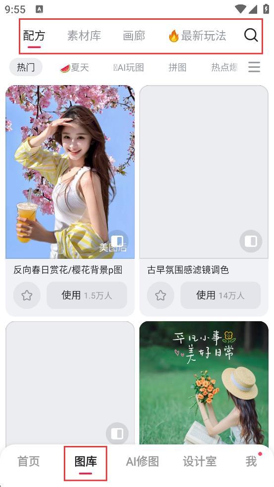 2、图库页面上方有配方、素材库等分类,浏览热门玩法,选喜欢的配方如反向春日赏花p图,点击使用应用修图效果。