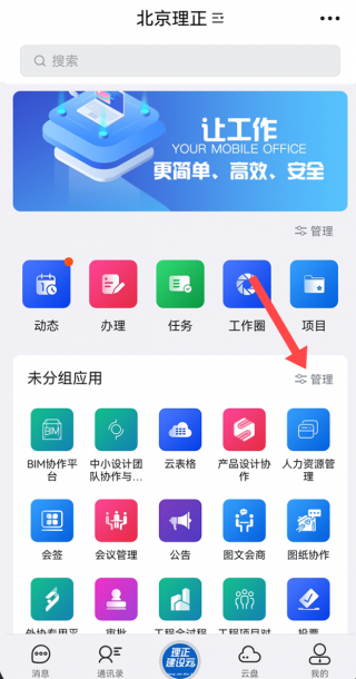 2、主界面呈现北京理正相关内容,有让工作更简单高效安全标语,布局动态办理等功能区,未分组应用可管理,方便查找办公工具。