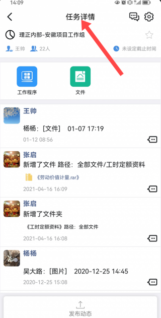 3、任务详情页显示理正内部项目组信息,含成员、工作程序与文件,呈现王帅等成员动态,可发布新动态,便于协同办公沟通。