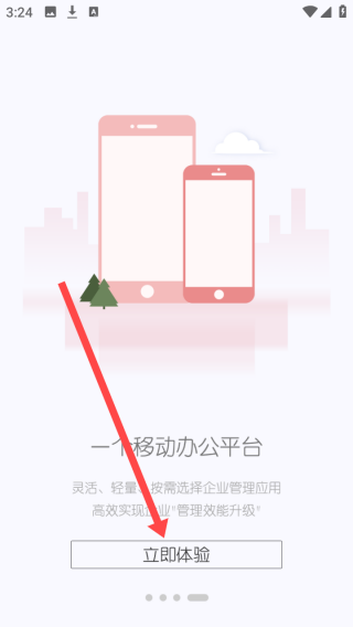1、启动页展示移动办公平台理念,以两部手机和城市背景呈现,强调灵活轻量按需选应用,助力企业管理效能升级,设立即体验按钮。