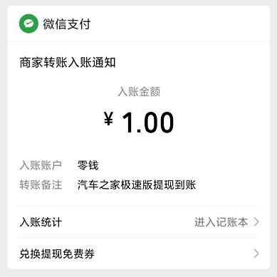 除了填写邀请码得金币这个福利以外,汽车之家极速版还为新用户提供了一元现金奖励。只要下载APP,进入后即可获得1元现金,可直接提现到微信。(亲测已到账)