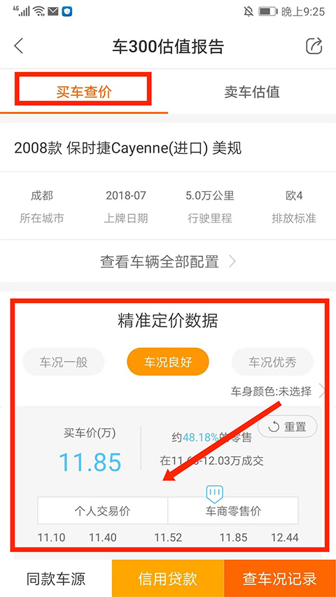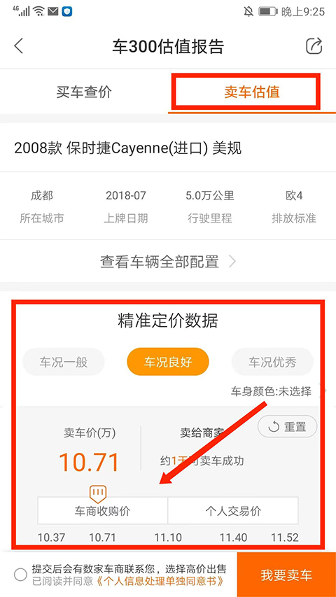进入【卖车估值】界面,可看到当前车辆的卖车价、车商收购价和个人交易价,