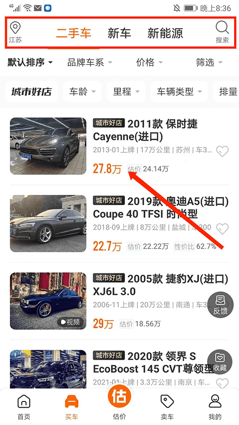 进入【买车】界面,左上角可选择地区,车型分为【二手车】、【新车】、【新能源】三大类,用户也可以选择右上角【搜索】选项查找感兴趣的车型,这里以第一辆为例,