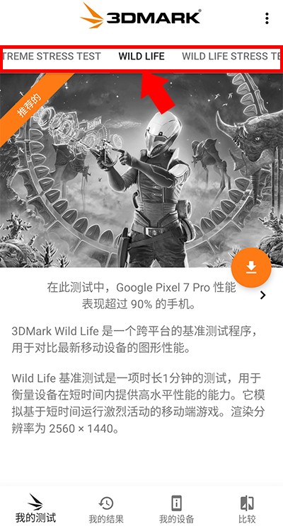 1、在本站下载并安装3DMark安卓版,打开程序之后在上方选择我们想要测试的项目