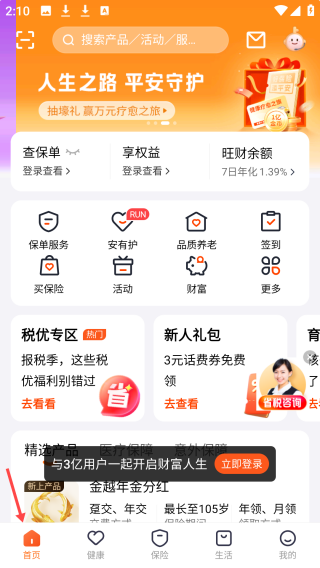 1、点击首页,顶部有搜索与人生之路平安守护标语,中部是保单、权益等功能,下方有税优、新人礼包等福利板块。