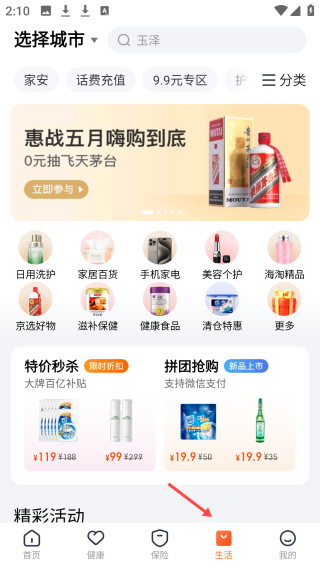 3、点击生活界面,能选城市,含话费充值等分区,有惠战五月活动,展示多样商品及秒杀等促销。