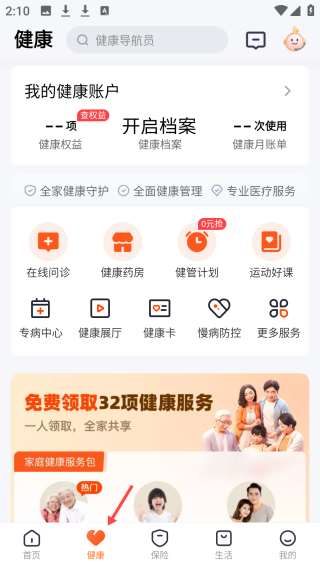 2、点击健康界面,含健康账户功能,提供在线问诊等多样服务,还有免费领32项全家共享健康服务的活动。