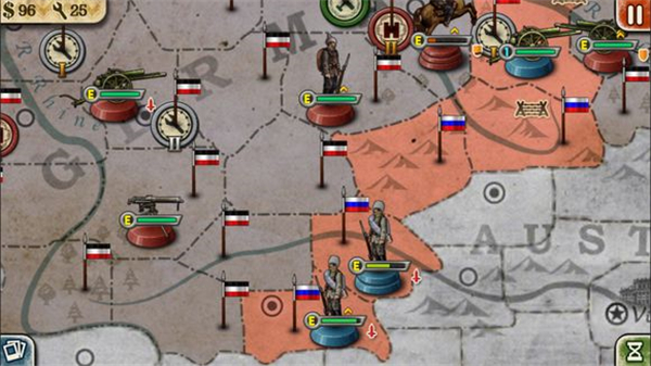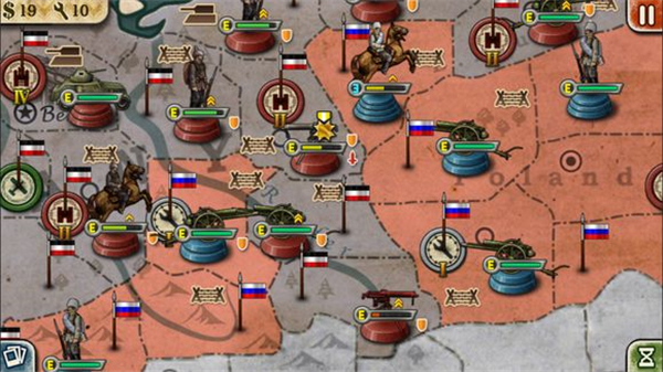 2、第一天,在华沙和波兰西南角的一级工厂里造3门大炮(华沙1门,西南角2门),先用西南角的大炮轰一下旁边西里西亚的德国步兵(要打到他掉一大半血,否则重来),华沙的大炮轰波兰西北角的德国机枪兵