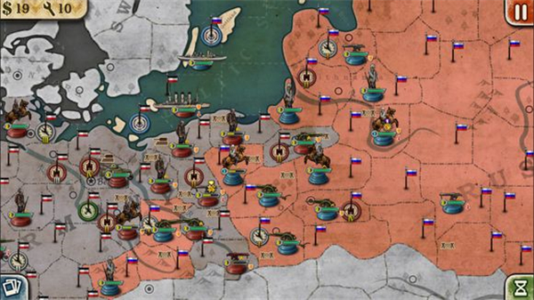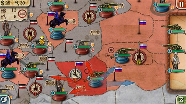 首先帝国模式下我们要做的就是扩展自己的领地利用手上的现有资源去占领敌军,在游戏中我们点击我们自己的军队会出现箭头代表可以前进的方向,蓝色代表安全方向,而红色这是代表我们需要进行战斗,胜利之后这块区域就能够由我们来控制。