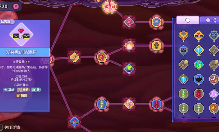 思路非常简单,打分裂,连接能带大肠的触角(最好用环绕的那个),大肠再随便接个撒毒的腹,疯狂撒毒,后期不断优化替换就好了。后面有条件弄个幻娃的胃液袋(叠毒触发)连接冰果和磁吸果,怪近身直接无限冰冻加自动收集直接解放双手。