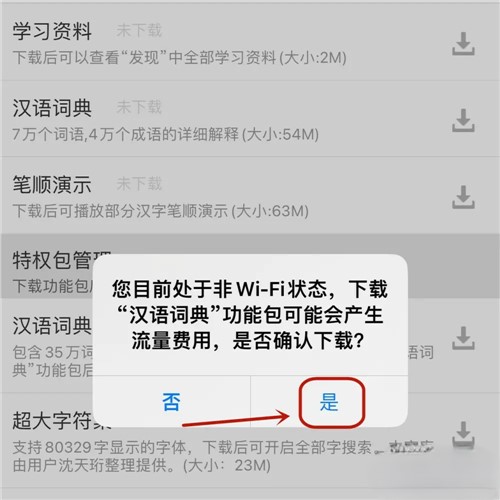 5、在【汉语词典】页面,点击【是】按钮,即可开始下载汉语词典资料包。