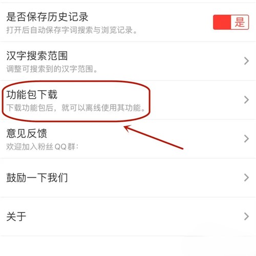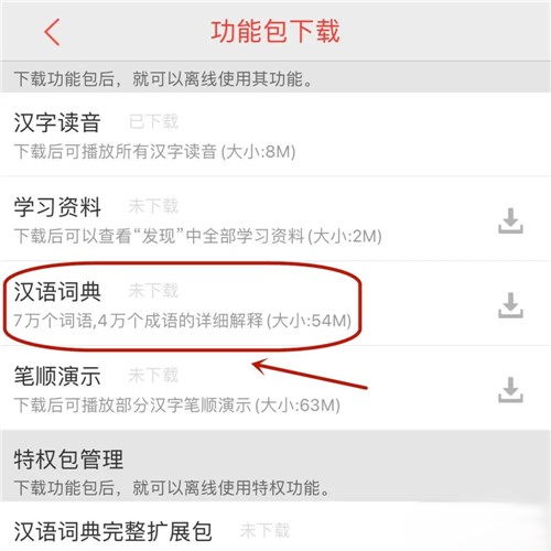 4、在【功能包下载】页面,点击【汉语词典】选项。