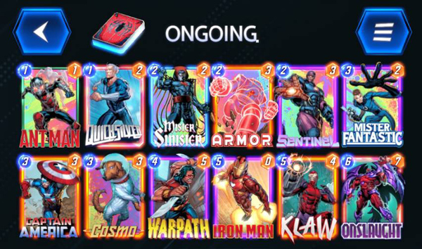 中文卡表: 13号特工、曼蒂斯、收藏家、电索、凯、哨兵、神奇先生、美国队长、月亮女孩、白皇后、恶魔恐龙、狂攻