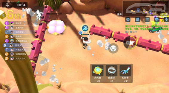 此区域有两部分,且障碍均为摇摆类(逃跑吧少年官方把它叫做“咸鱼大摆锤”),在较低的水面上用跳高类的道具会被攻击到。从桥上走是很好的选择,水面也不差。第一部分摆锤的空隔,利用捣弹和皮卡的高速度可以直接开过去,小心不要被打到就是了。用跳高或是滑板也可以跳过摆锤,放心,绳子是没有伤害滴。第二部分用载具过比较靠运气,建议走水路,从水路走的话,可以用飞爪抓对岸的石头快速移动,或者是震荡波向前位移。