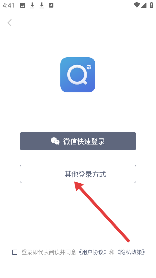 1、登录页顶部有图标,提供微信快速登录与其他登录方式,下方提示登录即同意用户协议和隐私政策。