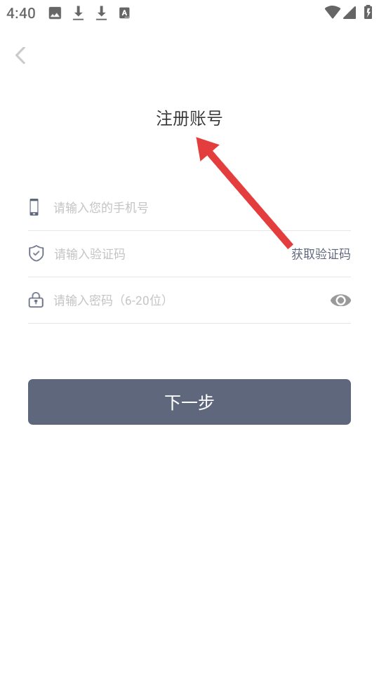 3、注册账号界面要求填写手机号、验证码及6、20位密码,完成信息输入后点击下一步即可注册。