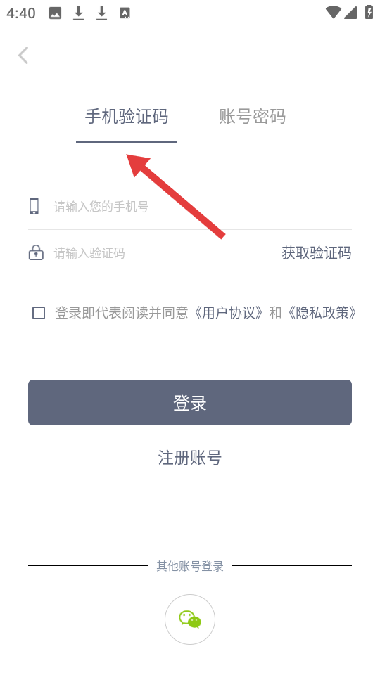 2、点其他登录方式后,出现手机验证码和账号密码登录选项,需输入手机号验证码,可跳转注册账号。