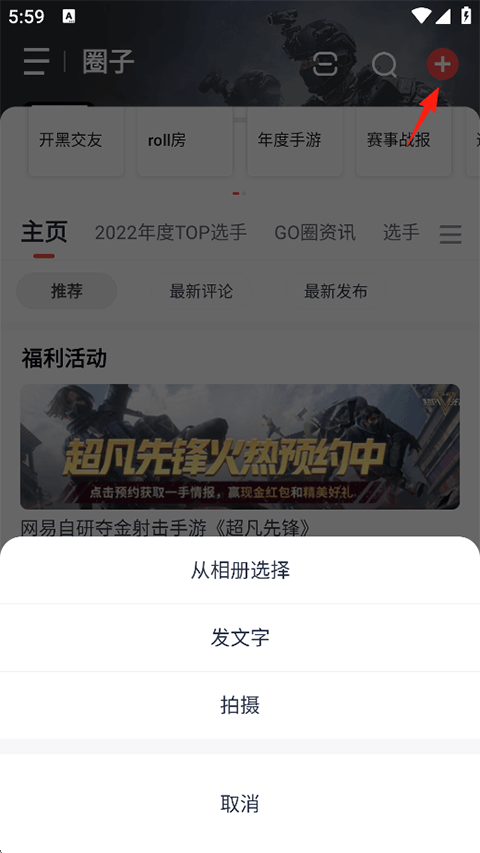 2、回到首页点击右上角的+按钮,可以发布上传你的游戏动态;