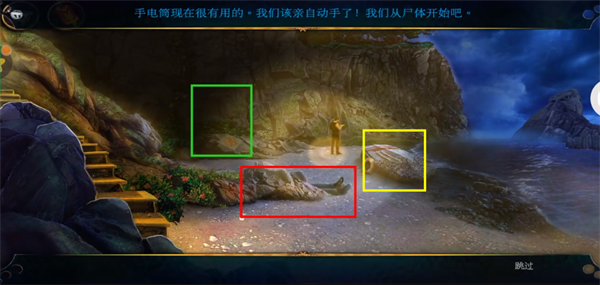 7、回到悬崖,对阴影处使用手电筒。先对红框处点击放大后,先对尸体使用照相机留下证据。之后点击尸体头部的布移开后,对尸体脸部使用照相机留下证据。最后点击尸体手上的手表得到证据,之后点击尸体身上的衣服掀开,找到钱包,得到里面的密码图案。之后点击黄框处的小船放大,点击移开救生圈后,对小船左侧有绳子的地方使用充气浮标,之后使用打气筒(抽气泵),多次点击小船后得到马克的钱包,里面有一张纸条进行阅读后得到线索,。最后点击钱包左侧,得到卡片。再在绿框处点击放大后使用剪枝钳,得到里面的第二个金字塔碎片
