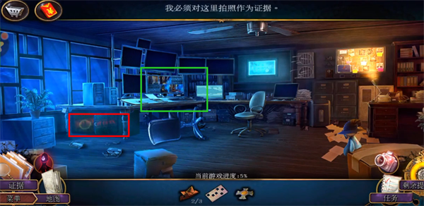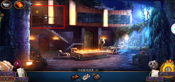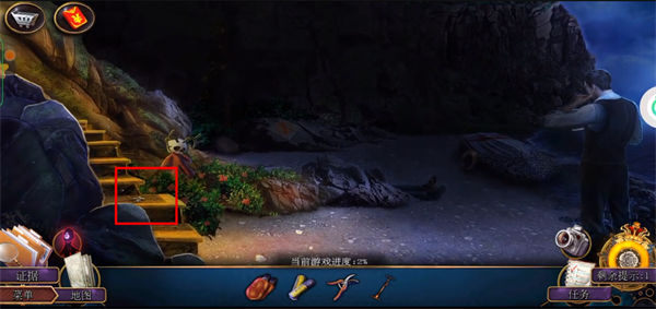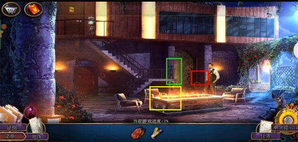 4、进屋后先对话。之后直接右上角前往后院。后院里先点击中间的侦探,拿到红框的照相机,之后点击黄框放大后得到剪枝钳。绿框点击放大后得到门左侧的抽气泵。最后点击灰框处,使用刚刚得到的照相机进行拍摄留下证据,完成教程。