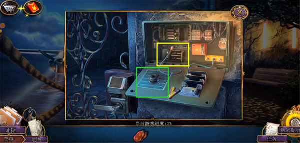 3、下图红框处点击放大后使用之前公文包里的尖嘴钳,打开分电箱,之后分电箱里先点击红框得到电池,之后点击绿框接上线就可以工作,盖上箱子,点击靠左的白色按钮,门打开,前往门厅。