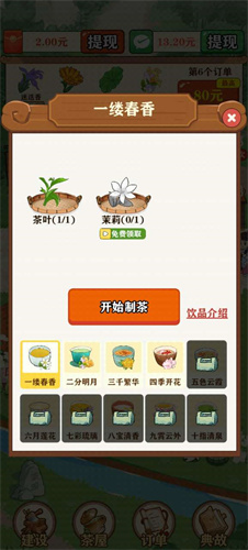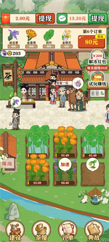 2、游戏获取红包的方式特别多,比如完成订单,试玩游戏,收集典故、制茶等,操作特别的轻松。