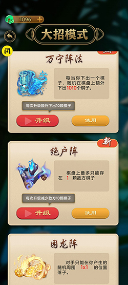 1、万宁阵法每当你下厨一个棋子,随机在棋盘上额外下出x个棋子;