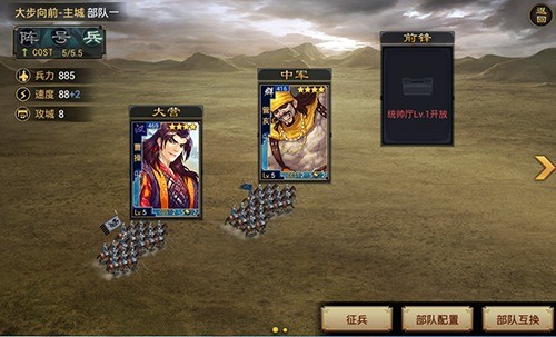 2、点击部队配置,将空闲的武将拖动到“大营”、“中军”、“前锋”等位置上,对应位置如果有武将就将被拖动的武将替换,之后点击“返回”即是完成部队编排。必须一提的是,同兵种、同阵营和特定称号组合的武将在同一部队中,可获得属性加成,而不同武将的技能、攻击距离各不相同,所以武将的搭配和位置十分讲究。建议是同阵营和特定称号的武将放在同一支部队,攻击远而防御强的骑兵放在“前锋”冲杀,而攻击距离较远而防御弱的弓兵、步兵放在中军和大营作为强力DPS。为什么不配同兵种部队?因为兵种之间存在相克,弓兵克骑兵,骑兵克步兵,步兵克弓兵,所以同兵种部队一般用来克制敌对玩家阵容,如敌对玩家多用弓兵武将部队,那么我就全用骑兵武将部队,当然,这样一来自己也非常容易被克制。