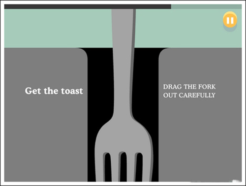 这关死亡率很高,具体玩法就是直线把面包不让面包触碰到面包机即可,小编在这关滑铁卢了若干次,后来终于掌握方法,先拔一次叉子,然后在面包上来以后松手马再按面包往上拔就可以了,当然,手是不能抖的,手一抖烤面包就直接变成烤人了,小人被烧焦以后的表情略悲伤。