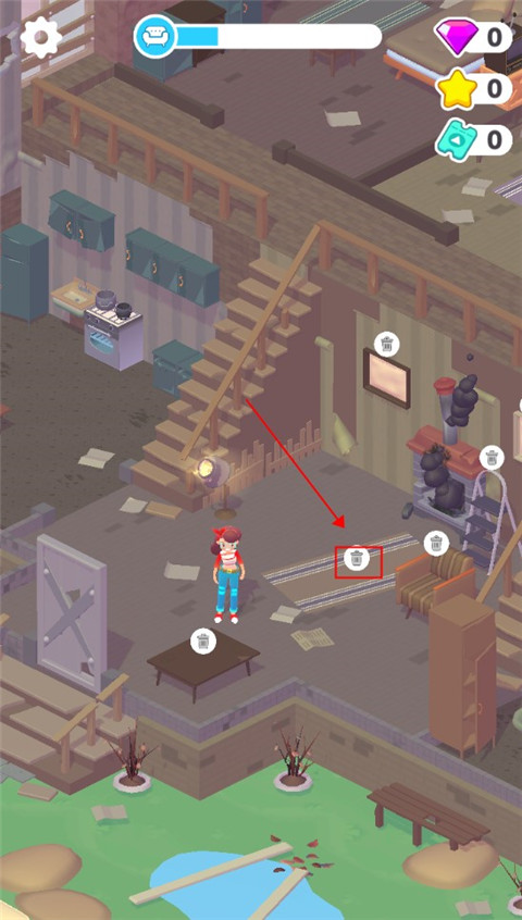 2、收拾完瓶瓶罐罐后,点击垃圾桶的标志可以将家具收起来,到时候重新摆放