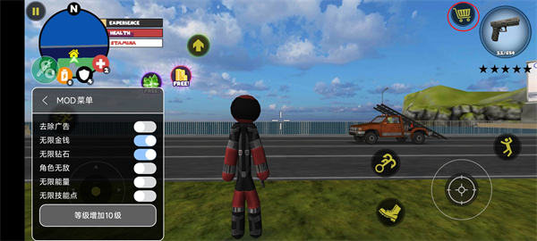 PS:火柴人绳索英雄无限金币钻石版游戏内置MOD菜单,可开启去除广告、无限金钱、无限钻石、角色无敌、无限能量、无限技能点,每点击一次即可将等级增加10级。