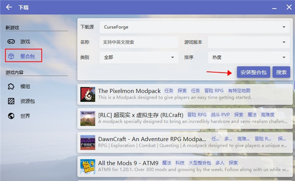 步骤:依次点击下载--模组--搜索模组--找到后进行安装即可