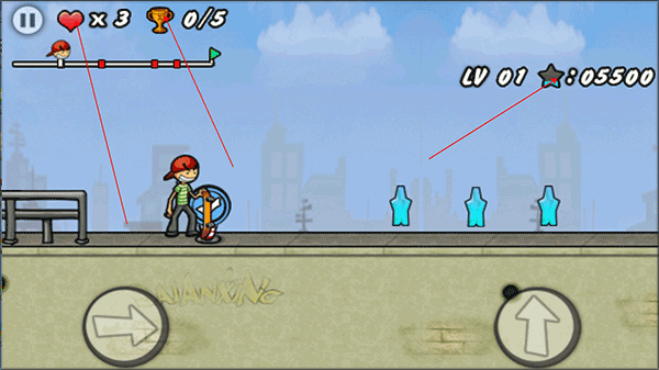 3、避免游戏中的障碍,否则你的滑板将无法到达这里。