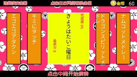 进入太鼓达人安卓版游戏我们可通过点击左右俩次切换不同的曲目,点击屏幕中间即可开始演奏