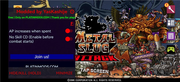 选择佣兵是可以选择SNK或者公会会友提供的佣兵帮助战斗,每天免费三次(不同模式单独计算)。佣兵右边的百分比是OPS才有的,是当前卡组的积分加成情况,下面的是本次OPS才有的奖励兵种出现几率加成情况。最下面的选择道具从左到右分别是:裤子:使用raid扫荡过关时可以获得S级过关加成,并且解锁全部人质、卫星(自动的无敌的攻击单位,感觉攻击力一般,跟着你的部队前进)、宝箱(本次战斗后结算的奖励增加)、汽油(战斗开始后AP积攒速度满级,但初始AP还是为零)、雷达(本次战斗后一定会额外找到一个俘虏,解救隐藏的俘虏数量就是决定你过关后的道具获取数量)、最后一个是购买道具,这些道具都是耗材,用一个少一个,所以一定要用在刀刃上,除此以外在公会OPS中第一项裤子处会换成另一种道具,火龙果(误)使用效果是本次战斗中所有友军单位攻击力上升30%。