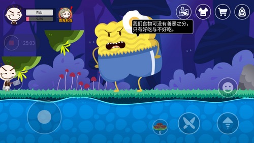 6、进入洞口后向右走打败香菜boss。通过悬浮台阶上下跳跃可以躲避香菜boss攻击,同时使用背包里各种菜肴buff加成,或者直接用饭团炸弹轰炸,就能打败香菜boss。打败香菜boss能获得麻辣香菜冰淇淋食谱,通过食谱我们可以制作麻辣香菜冰淇淋。