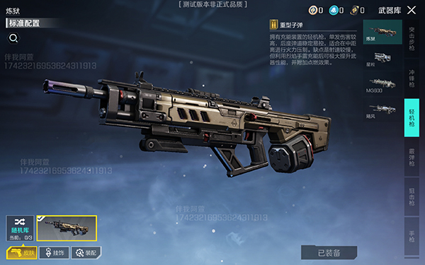 炼狱轻机枪,拥有充能装置的轻机枪,单发伤害较高,后座弹道稳定易控,适合在中距离进行火力压制。缺点是射速较慢,但利用烈焰手雷充能后可极大提升武器性能,并附加点燃效果。
