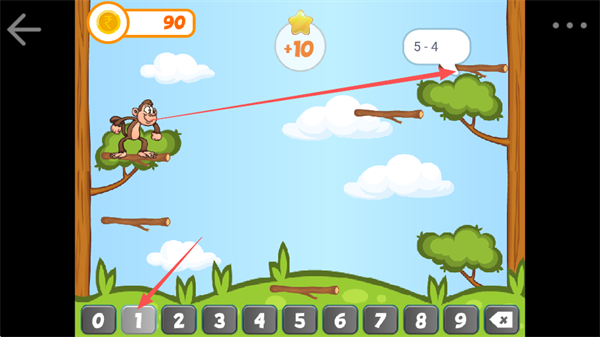 7、根据给出的“算式”,点击屏幕下方的“数字”来回答问题,回答正确,猴子就可以跳上相对应的数值。