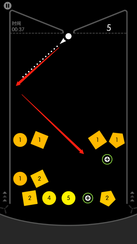 几个方块围起来时,利用墙壁,将球弹到它们的包围圈内,能够较有效率的消除。