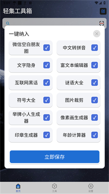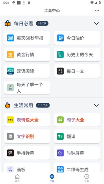 轻集工具箱是一款全能型的工具箱软件,这里提供了各式各样的工具,今日油价,翻译,画板,量角器,历史上的今天,每日早报等等,并且将这些工具都进行了分类,方便用户使用,还提供了搜索功能,让你可以快速精准的找到你想要的目标资源,软件中还没有广告,用起来也很简单顺手哦。