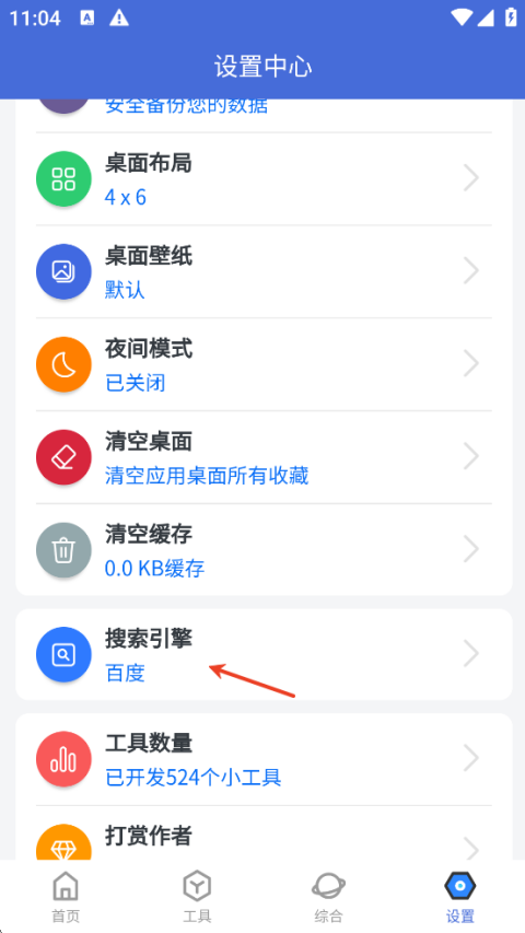 1、打开软件之后来到设置界面,点击搜索引擎。