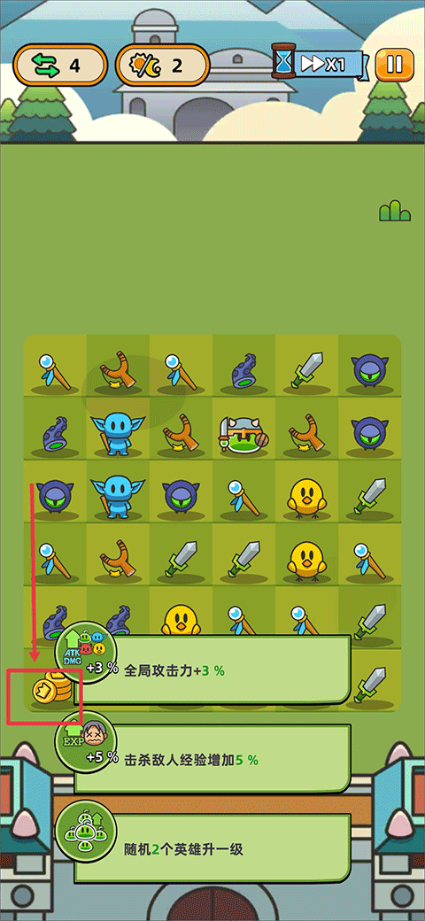 3.地图中还会有金币,玩家可以将他们合成为宝箱,宝箱解锁后会提供三种技能,玩家可以根据自己的需求选择