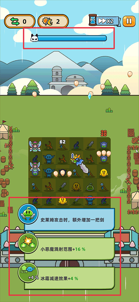 5.我方英雄在成功抵挡出现的敌人后会获得分数,当上方进度条满时同样可以解锁技能选择功能