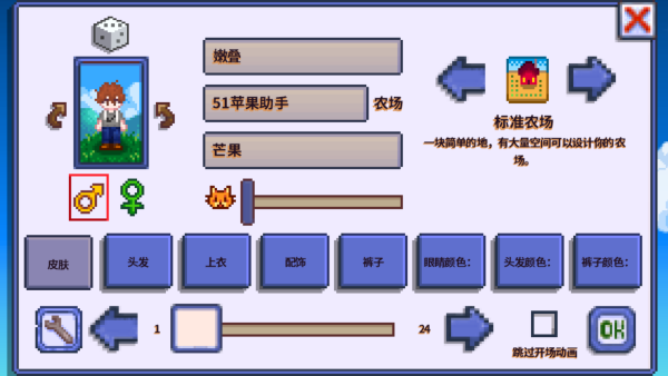 在角色创建的界面,允许用户选择角色名称、性别、外貌、农场名称以及宠物偏好。
