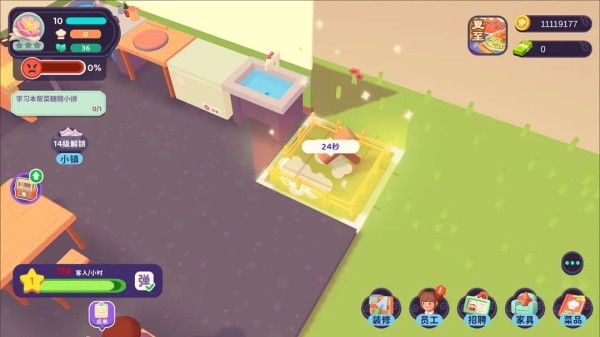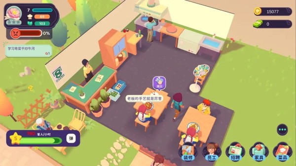随着你招待的客人越来越多,餐厅积攒到一定的口碑时,你就可以通过招聘服务员和厨师来加快照顾顾客的速度,身为店长的你就可以解放双手啦!