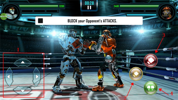 2、在左下角区域是控制方向的,2按钮则是轻击,3按钮是重击,4按钮则是格挡。