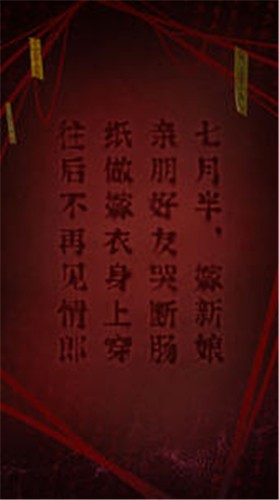 七月半,嫁新娘,亲朋好友哭断肠。纸做嫁衣身上穿,往后不再见情郎。前世的村子陈风恶俗导致相爱的男女主双双殒命,从剧情中发现虽然出现的鬼魂使玩家不安,但是并没有伤害主角,反观真正坏的却是人心,剧情的层层递进很好的让玩家进入其中。整体游玩后久久无法从这部的剧情中脱离出来。