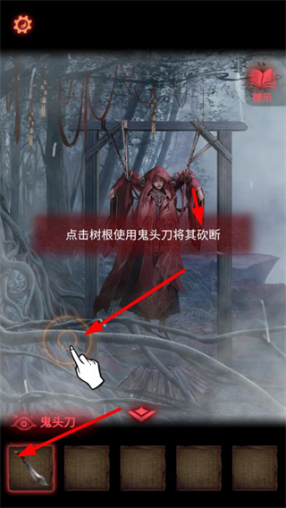3、点击树根使用鬼头刀将其砍断,清除路障,继续在场景前进点击前方身着红嫁衣的人。